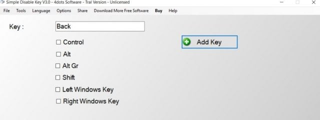 Programımız açıldıktan sonra karşımıza basit bir ekran çıkacaktır. Key ibaresinin karşısındaki satıra tıklayıp, devre dışı bırakmak istediğiniz tuşa basın. Bastığınız tuş satırda görünecektir. Ctrl, Alt, Shift gibi özel tuşlar için satırın altındaki kutucukları seçebilirsiniz.