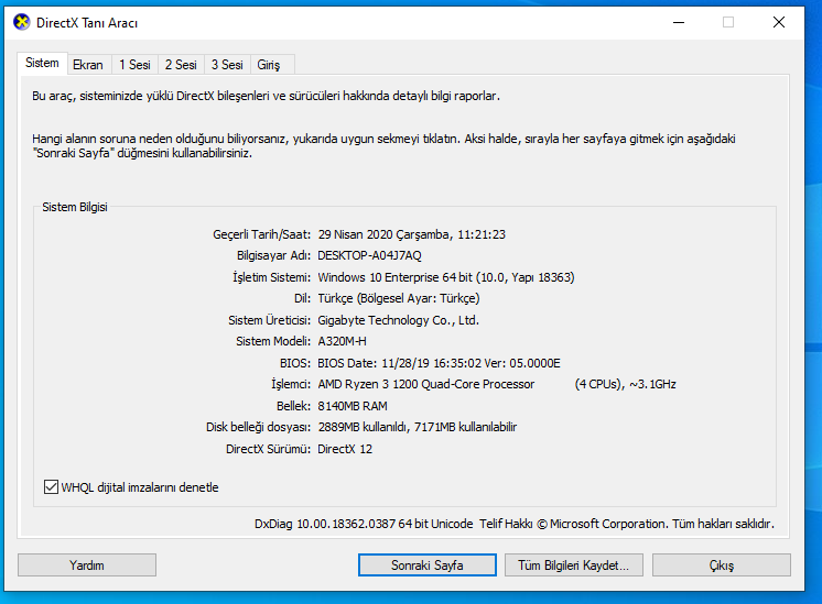 - AMD Ryzen 3 1200 işlemci.
