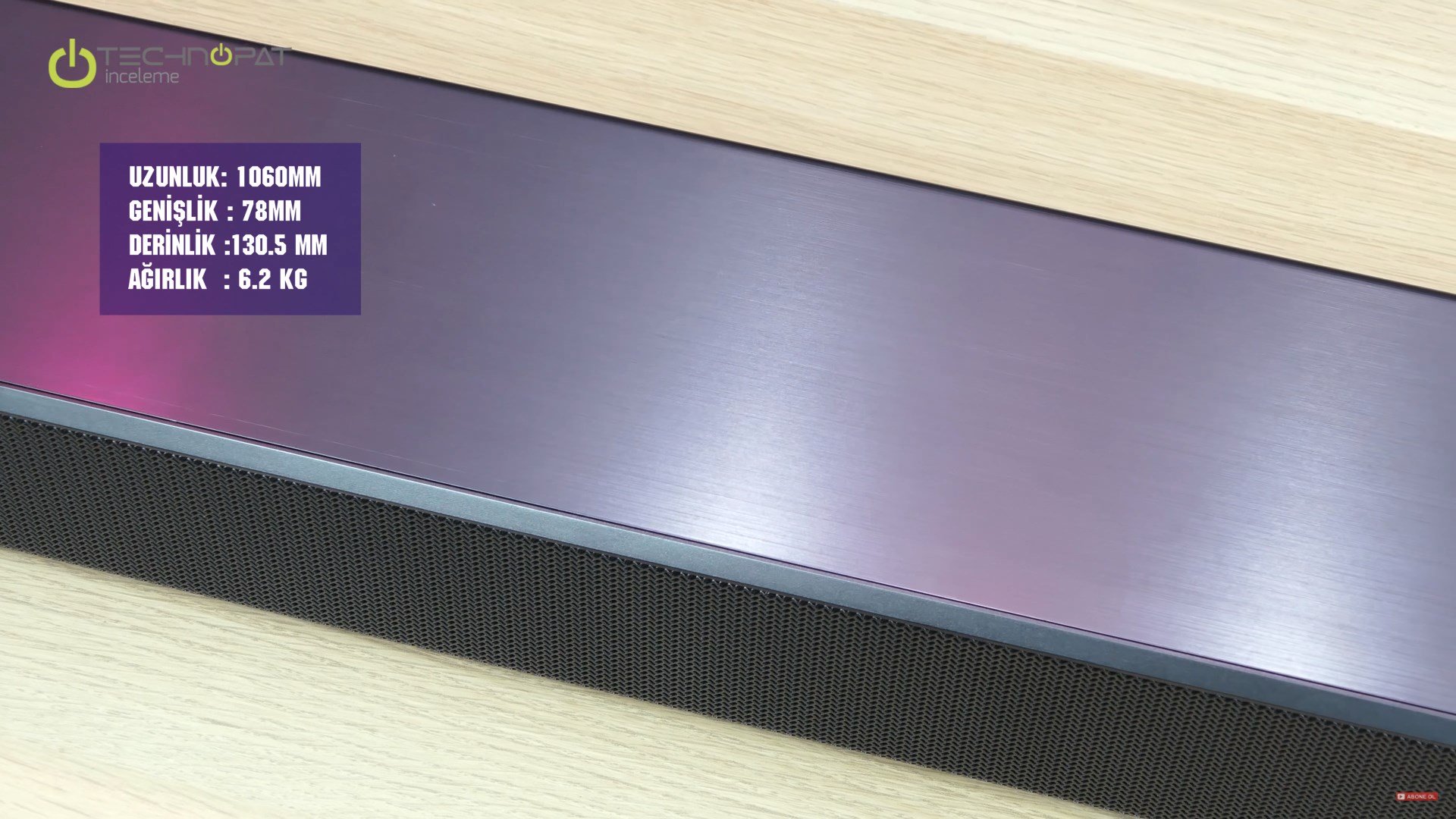 1060mm boyundaki soundbar, 78mm yüksekliğinde, 130.5mm derinliğinde ve 6.2kg ağırlığında.
