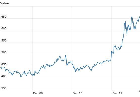 Popülerlik açısından Bitcoin’in hemen arkasında olan Ethereum da hızlı bir şekilde yükselmeye başlayan para birimlerinden. Geçtiğimiz ayın 13’ünde 300 dolar seviyesinde olan Ethereum, 22 Kasım’daki ve 11 Aralık’taki sıçramalarıyla 656 dolar seviyesine ulaştı. Aşağıdaki grafikte 11 Aralık sıçramasının sürdüğü görülebiliyor.