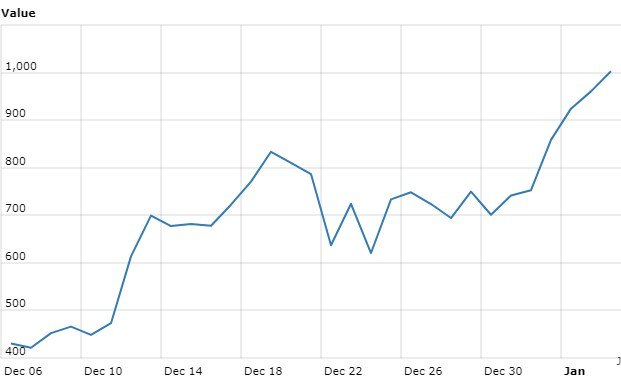 24 saat içinde 940 dolar seviyesinden 1.030 dolara yükselen Ethereum, şimdilik 1.000 dolar seviyesinde seyrediyor. Bu yükselişin ne zamana kadar süreceği ise merak konusu.