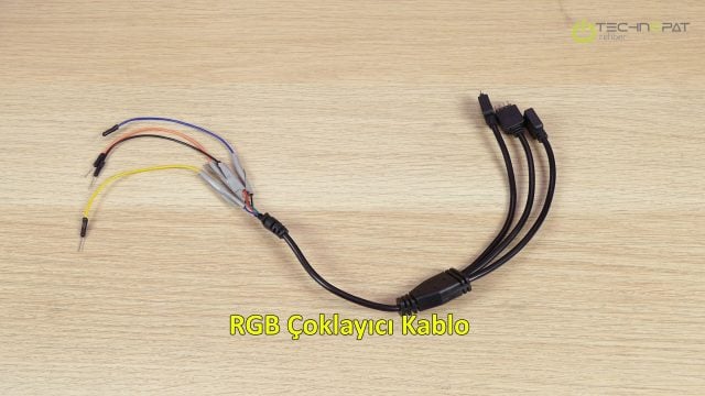 Eğer kasanızın farklı noktalarına birden çok şerit led koymak istiyorsanız bu kablo çok işinize yarayacaktır. Tek RGB çıkışınızı çoklayarak birden çok parça led şeritinizi aydınlatmanızı sağlar. Google’da arattığınızda 3 veya 4’e kadar çoklayan kablolar bulabilirsiniz. Biz çoklayıcımızı modifiye edip tekli ucunu iç kablolarına ayırdık. (3 adet renk kablosu, 1 adet güç kablosu)
