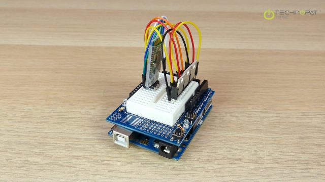 Önce Arduino Uno’muzun üzerine Proto Shield’ı takıyoruz ve Proto shield ile gelen mini breadboard’u ortadaki boşluğa yapıştırıyoruz.