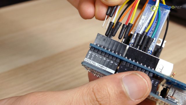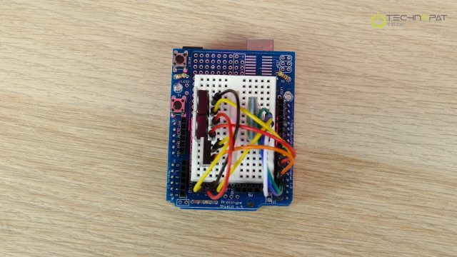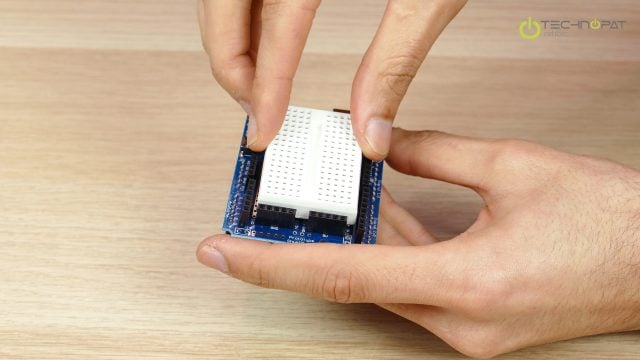 Önce Arduino Uno’muzun üzerine Proto Shield’ı takıyoruz ve Proto shield ile gelen mini breadboard’u ortadaki boşluğa yapıştırıyoruz.