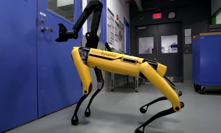 SpotMini’lerin bir tanesi çeşitli işler için kullanabileceği bir kola sahip. Herhangi bir ek donanıma sahip olmayan SpotMini (kolsuz SpotMini de diyebiliriz), çıkmak istediği kapıdan çıkamayınca daha gelişmiş olan SpotMini’yi bekliyor. İşlevsel bir kola sahip olan gelişmiş SpotMini de kapıyı kolaylıkla açarak arkadaşının geçişini sağlıyor.
