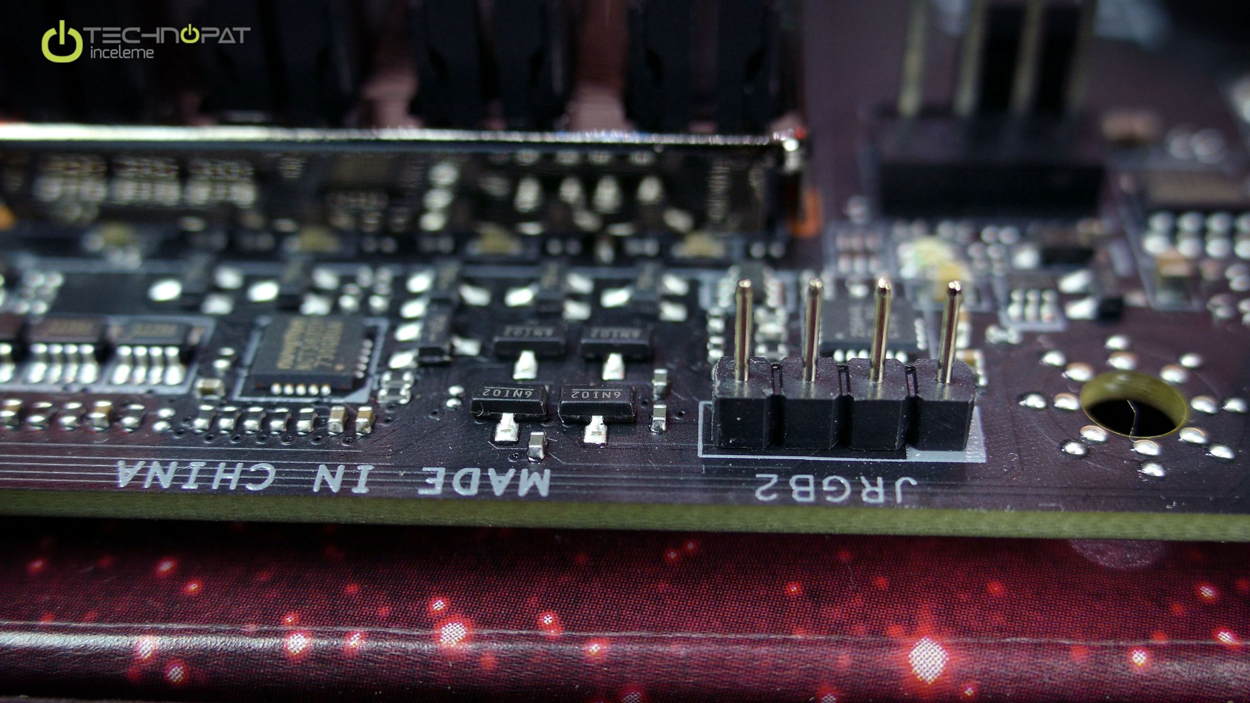 Aydınlatma için 2 adet 4 pinli 5050 RGB Led Strip 12v bağlantısı ve 1 adet 3 pinli 5v bireysel olarak adreslenebilir rgb led bağlantısı da bu anakart üzerinde yer alıyor.