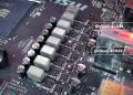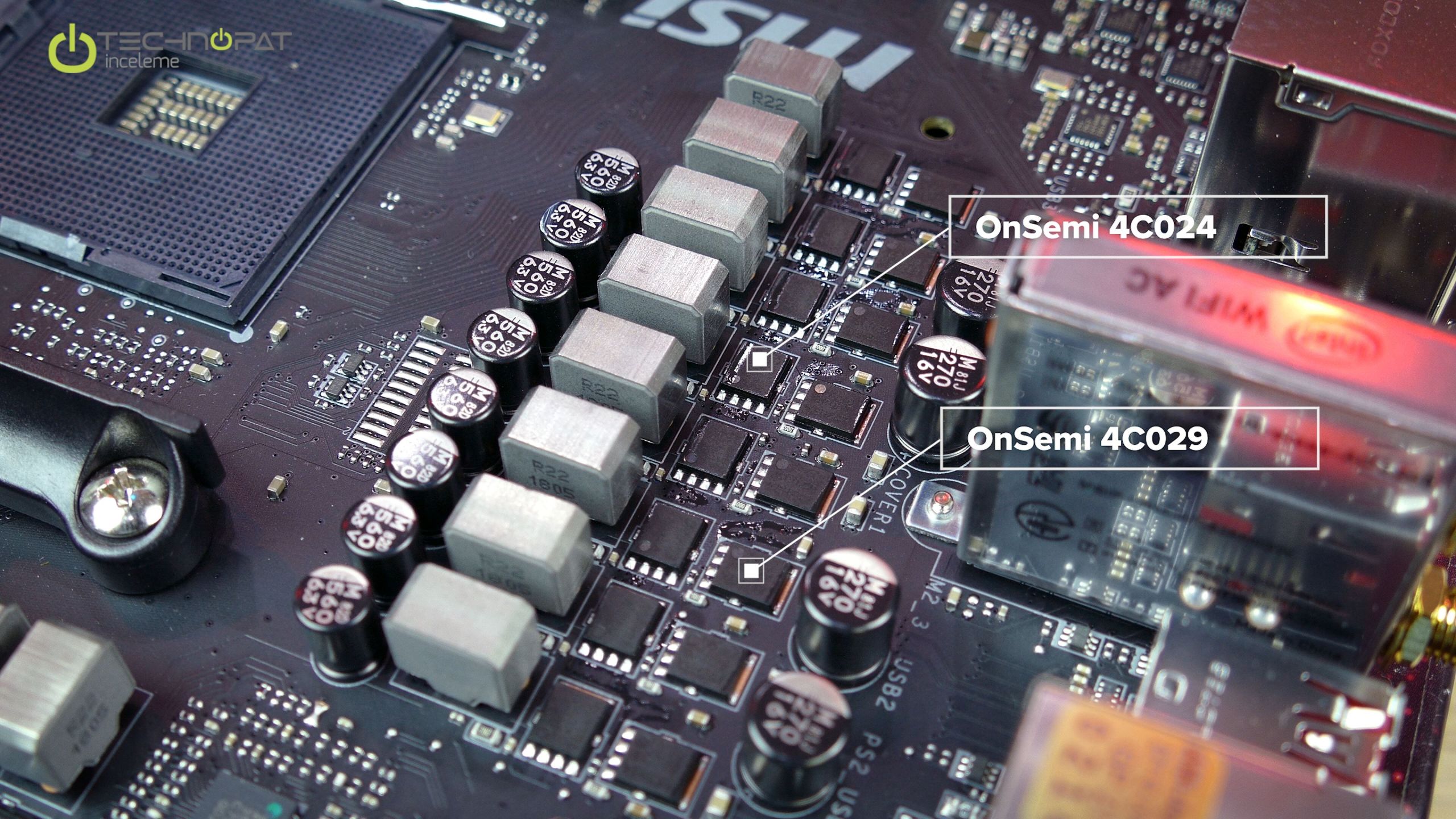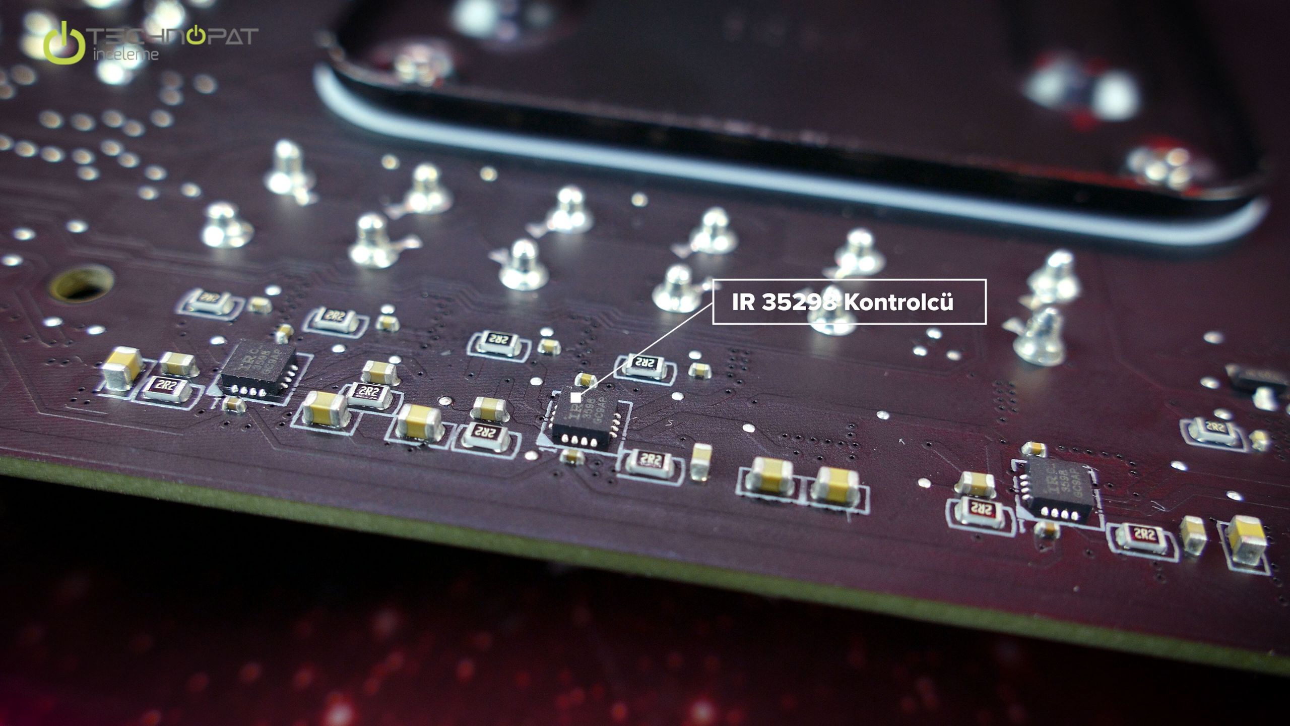 Üst kısımda Onsemi 4C029 mosfetler ve hemen altında Onsemi 4C024 mosfetler tercih edilmiş. Ve bu mosfetler IR35201 tarafından kontrol ediliyor. Bu kontrolcü 6+2 faza kadar kontrol edebiliyor. Bu fazlardan 6’sı CPU çekirdeklerini, 2’si diğer bileşenleri besliyor. Ancak burada toplam 14 tane faz görüyoruz. Dolayısıyla burada PWM faz çiftleme yapıldığını anlıyoruz.