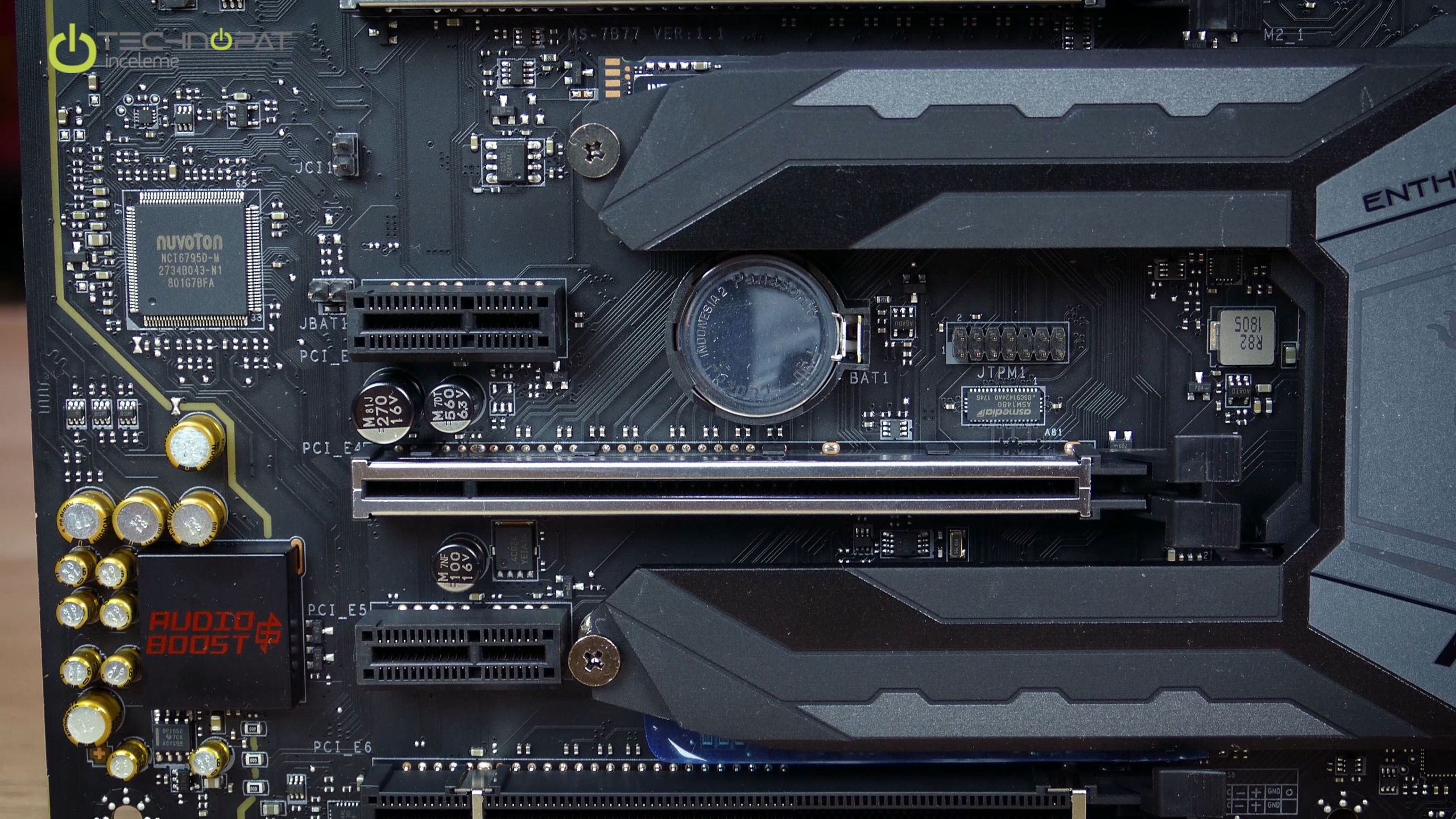 Bunlardan 2 ve 4 numaralı olan metal korumalı x16 portlar PCI-Express 3.0 destekli ve tek GPU’yu X16, iki GPU’yu x8/x8 konfügrasyonunda çalıştırabiliyor. Haliyle bu da NVIDIA SLI ve AMD Crossfire desteği anlamına geliyor. Geriye kalan 3 adet x1 ve en altta x16 port ise PCI-Express 2.0 standardını kullanıyor. En alttaki X16 portun maksimum x4 hızında çalışabildiğini de belirtelim.