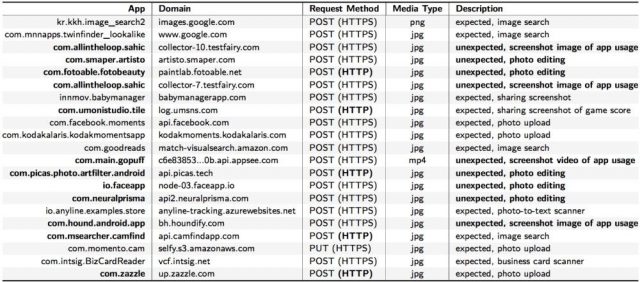 Toplamda 17.260 uygulamanın test edildiği araştırmada, yalnızca 21 uygulamanın potansiyel tehlike oluşturduğu gözlemlendi. Bu 21 uygulamanın 12 tanesi ise izinsiz bir şekilde görüntü gönderdi.
