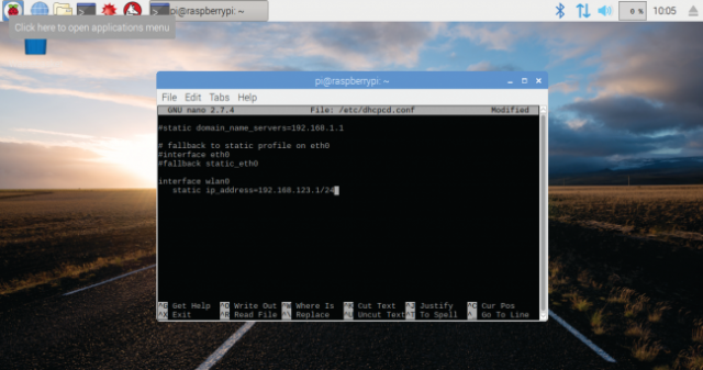 Pi’nin DHCP istemcisi isin varsayılan ayar dosyasını açmak için “sudo nano /etc/ dhcpcd.conf” komutunu girin. Ardından açılan dosyanın en aşağısına inin ve aşağıdaki satırı ekleyin.