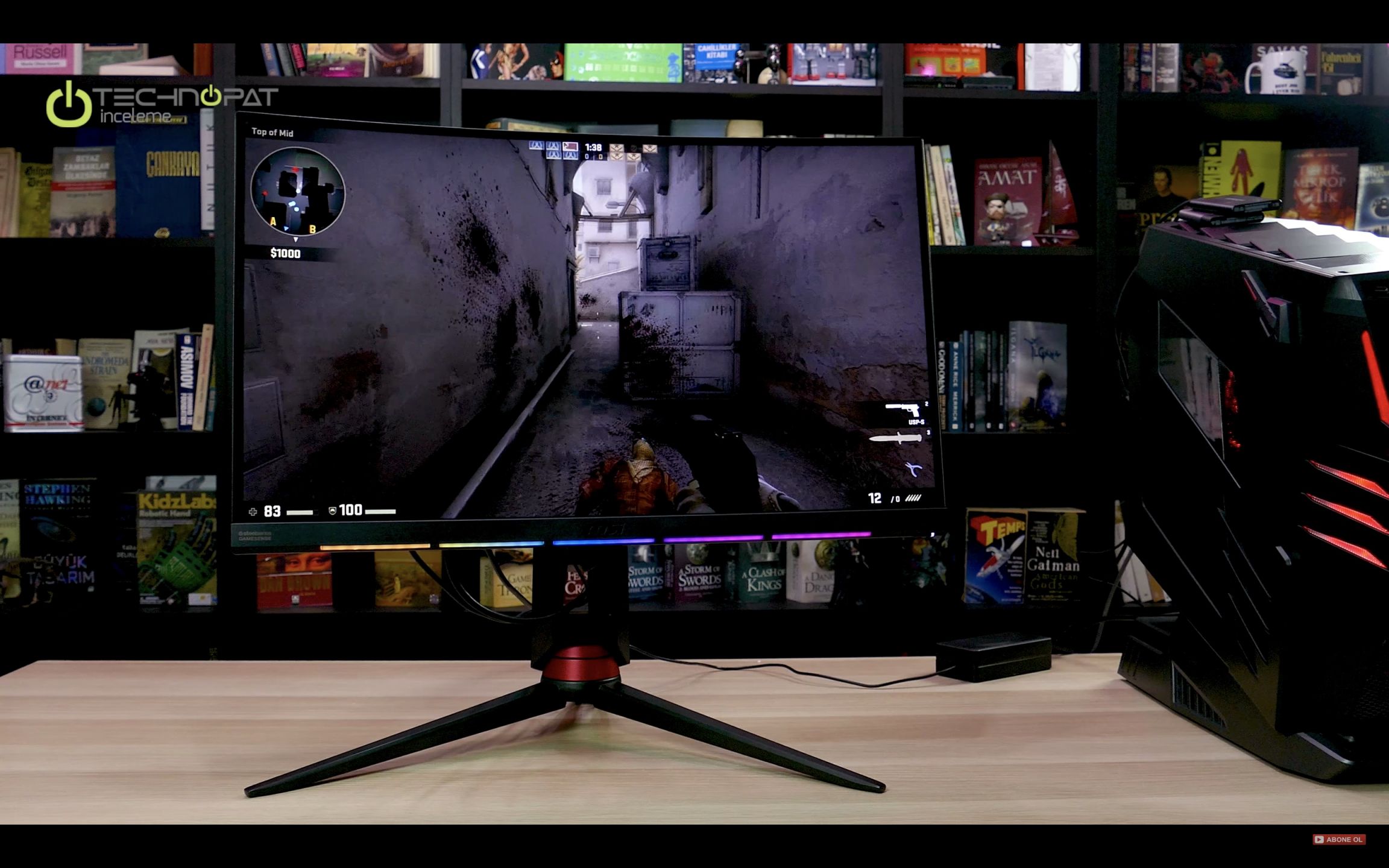 Monitörün alt ön kısmında özel RGB ışıklandırma sunuyor. Bu sadece süs olsun diye değil, işlevsel bir şekilde sunulmuş. İşin yazılım kısmı önemli olan ve ayrıştıran nokta. Oyunlarda sağlık, cephane gibi göstergeleri burada görmek mümkün. Bu da son yıllarda oyuncu monitörlerinde kozmetik RGB’nin ötesine geçen bir kullanım sunuyor ve Optix’i farklılaştırıyor.