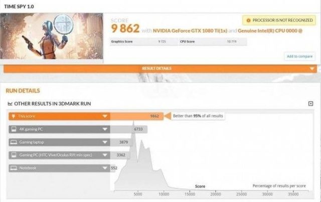 Intel Core i9-9900K, Futuremark’ın Time Spy 1.0 benchmark’ında ortaya çıktı. Asus ROG Strix Z370-F anakart, 16 GB DDR4-2666 RAM ve GTX 1080 Ti ile yapılan testte 9.862 puan elde edilmiş. Aynı testte Ryzen 7 2700X 9.387 puan alabiliyor. Core i7-8700K ise 8.935 puanda kalıyor.