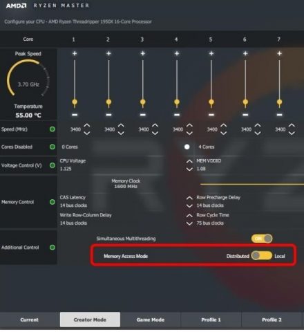 Ryzen Master uygulaması ile ya da BIOS aracılığıyla bu iki mod arasında kolaylıkla geçiş yapmak mümkün. Bu değişikliklerin uygulanması için bilgisayarın yeniden başlatılmasını gerektiğini de hatırlatmak gerekiyor. 2990WX’in 4 die topolojisi yüzünden UMA bellek erişim seçeneğini kullanamadığını da tekrar belirtelim.