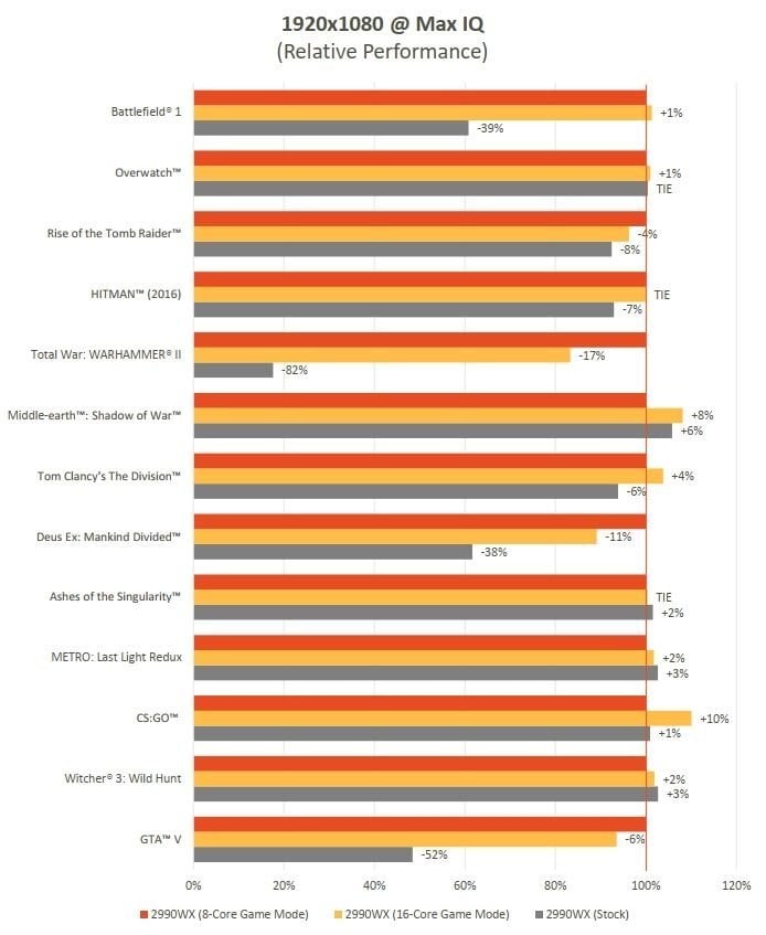 AMD’nin oyun modu özelliği sayesinde 8 ya da 16 çekirdekli bir konfigürasyona geçilip, tutarlı ve sorunsuz bir oyun performansı sağlamak mümkün oluyor. Oyun modu kullanılarak yapılan testlerde, varsayılan 2990WX konfigürasyonuna göre oyundan oyuna değişmekle birlikte, %82’ye varan performans artışı sağlanabiliyor.