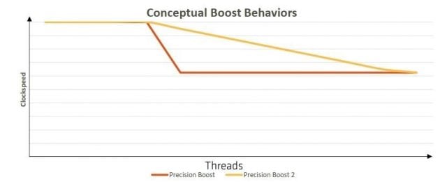 Precision Boost 2, bir termal ya da elektriksel limitle karşılaşmadan önce ya da oransal frekansa ulaşılana kadar, olası en yüksek frekansı sağlıyor. Tüm çekirdekler üzerinde de bu teknoloji uygulanabiliyor. Bir önceki teknolojiyle karşılaştırıldığında, saat hızının daha düzgün bir eğri şekilde değiştiğini görmek mümkün. Bu sayede daha yüksek ve sürdürülebilir saat hızları sağlanmış oluyor.