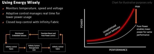 Bahsettiğimiz iki teknoloji ile yük altındaki işlemci güç tüketimini kontrol altına alan AMD, Pure Power teknolojisi ile çıtayı bir üst noktaya taşıyor. Bu teknolojiyle her Ryzen işlemcisi kendi silikonlarının özelliklerini tespit ediyor ve işlemciye özel güç yönetimi optimizasyonu yapılıyor.