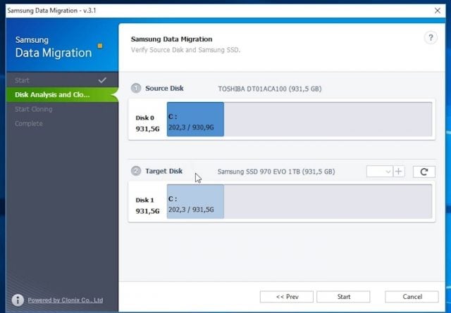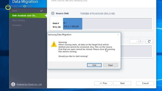 Karşımıza mevcut sistem sürücümüzün ve sistemi klonlayacağımız Samsung marka SSD sürücünün çıktığını görüyoruz. Burada dikkat etmeniz gereken nokta, arka planda çalışan uygulamaların tamamından çıkmak ve işlem süresince sistem diskin herhangi bir değişiklik yapmamak. Bu önemli çünkü, klonlama esnasında kullanılan dosyalar kopyalanmıyor.