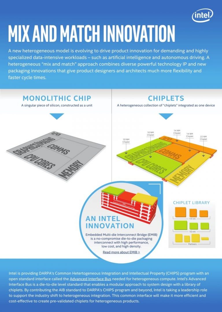 Intel gelecekte bu tasarım tarzını değiştirmeyi hedefliyor. Intel’in yeni yaklaşımı “chiplet” adı verilen, küçük ve bağımsız işlemci modüllerinin bir araya gelmesi prensibi üzerine kurulacak. Şirket bu çalışmalarında DARPA ile de işbirliği yaptıklarını belirtiyor.