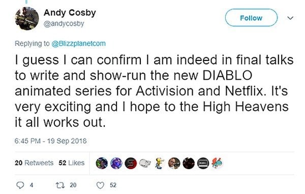 Andy Cosby, çekilecek olan Diablo konulu dizi hakkında bir tweet yayınladı.