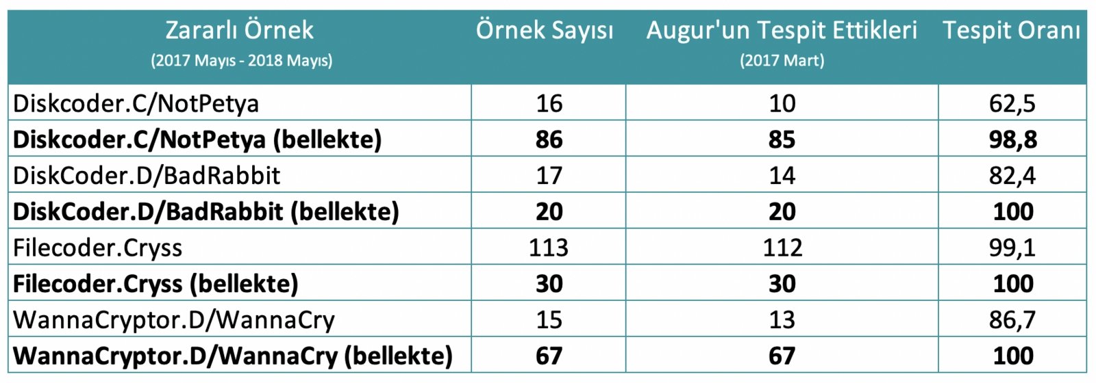 Sonuçlar, Augur sürümünün zararlı örneklerden daha eski olmasına rağmen, dosya algılama oranının yüksek, bazı durumlarda kusursuzluğa yakın olduğunu göstermektedir. Bununla birlikte, kurumlar için en önemli nokta, Augur’un enfekte olmuş cihazın hafızasında çalıştırıldığı sırada numunenin zararlı yapısını doğru bir şekilde tanımlayabilmesidir. Bu, yetkililere, şirket altyapısında büyük hasara yol açmadan tehdidi durdurma şansı sağlayacaktır.