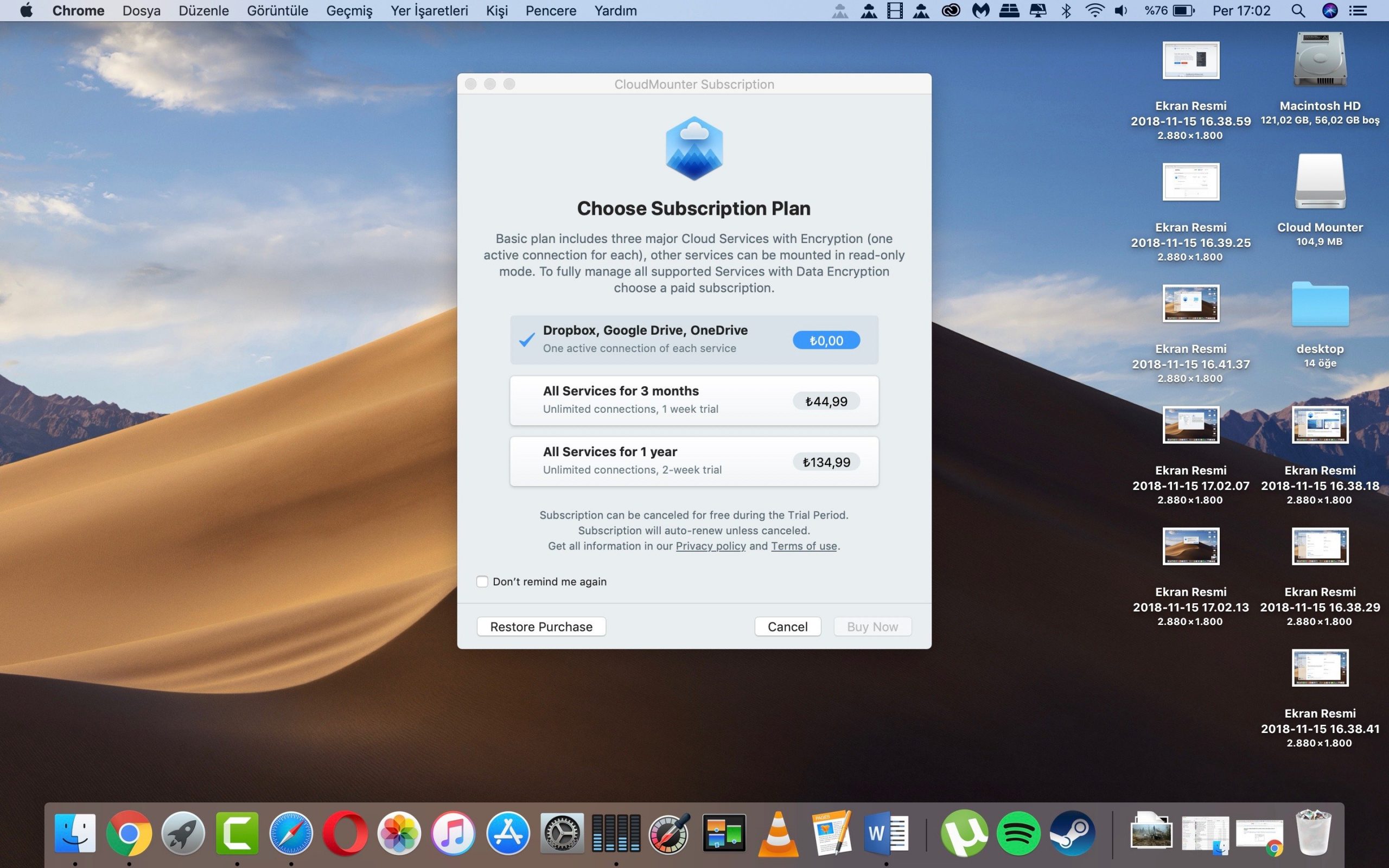 Uygulamayı indirip kurduktan sonra ücretsiz sürümü deneyip, memnun kalırsanız tüm özellikleriyle kullanmak için satın alabilirsiniz. Biz tam sürüm kullandık, sonuç kısmında ücretli ve ücretsiz farkına daha detaylı değineceğiz. CloudMounter ile Google Drive ve OneDrive’a uygulamadan giriş yaparak, Mac’e bir disk taktığımızda nasıl Mount ediliyorsa, aynı şekilde bulut sürücümüzün de yüklendiğini gördük.