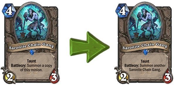 Shaman’ın Shudderwock destesinin en önemli kartı olan Saronite Chain Gang, oynandığında önceden kendini olduğu gibi kopyalıyordu. Tüm Battlecry efektlerini tekrarlayan Shudderwock da bu kart sayesinde kendini kopyalayıp oyunu sonsuz döngüye sokuyordu. Saronite Chain Gang, bundan böyle bir tane daha Saronite Chain Gang çıkartacak. Kendini kopyalama efekti olmadığı için Shudderwock’un sonsuz döngüsü engellenecek.