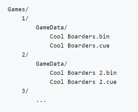 Gamesisminde bir klasör oluşturun. Bu klasörün içine ekleyeceğiniz oyun kadar ismi123.. olan klasör açın. Klasör isimleri bir artacak şekilde girilmek zorundadır. Daha sonra bu klasörlerin içineGameDataisminde bir klasör açın. Bu klasörün içine de oyunlarınızın .bin ve .cue uzantılı dosyalarını yerleştirin. Bu dosyaların isminin aynı olmasına dikkat edin.