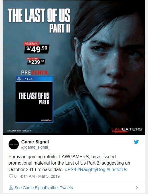 Naughty Dog oyun stüdyosu tarafından geliştirilmekte olan The Last Of Us Part 2 için henüz açıklanmış resmi bir çıkış tarihi bulunmuyor. Ancak Peru merkezli bir oyun mağazası olan Law Gaming tarafından yayınlanan bir posterde, bu tarih yanlışlıkla sızdırılmış gibi görünüyor.