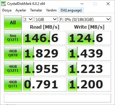 - 146.6 MB/s okuma, 124.6 MB/s yazma