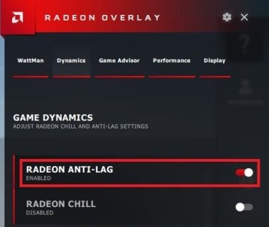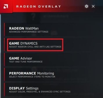 Radeon Anti-Lag özelliğini etkinleştirmek için ALT+R tuş kombinasyonunu da kullanabilirsiniz. Radeon Overlay menüsü açılacak ve pencerede yer alan “Game Dynamics” menüsü içerisinden Radeon Chill seçeneğini etkinleştirebilirsiniz. Ek olarak F11 tuşunu kullanarak da hızlıca bu seçeneği etkinleştirebilir ya da devre dışı bırakabilirsiniz.