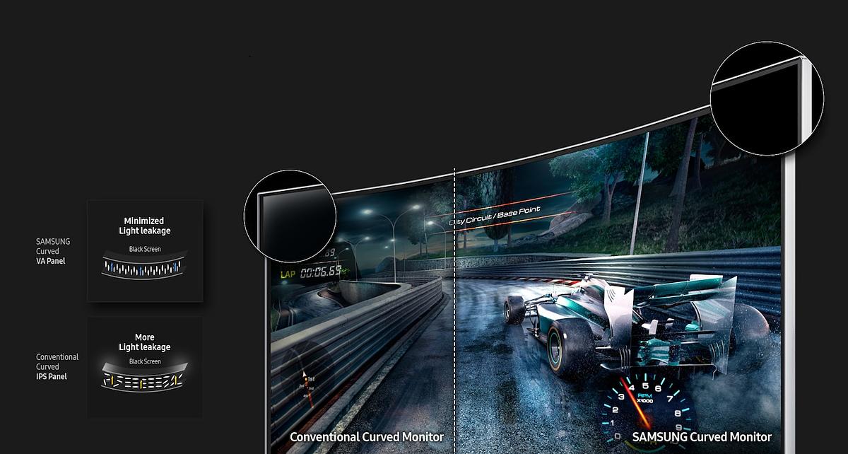 Samsung’un VA panellerinde bulunan dikey hizalı likit kristaller; ışık sızıntısını en aza indirger, kenardan kenara daha derin ve daha düzgün siyahlar sağlar, kavisli ekranın da yardımıyla arka plan aydınlatmasını IPS panellerinden daha etkin bir şekilde engeller.