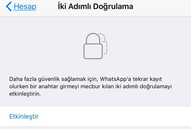 Son olarak, WhatsApp’ın iki adımlı doğrulama özelliği de güvenlik için önem taşıyor. Bu özelliği aktif ettiğinizde uygulamadaki herhangi bir hesabını doğrulama işleminde sizin oluşturduğunuz 6 haneli PIN’i girmeniz gerekiyor. İki adımlı doğrulamayı Ayarlar / Hesap / İki Adımlı Doğrulama / Etkinleştir yolunu izleyerek aktif edebilirsiniz.