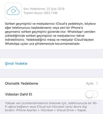 Son olarak, WhatsApp mesajlarınızın bulut yedeklemelerini devre dışı bırakmalısınız. Mesajları Apple iCloud gibi bulut hizmetlerine yedeklemek aslında herhangi bir durumda yedekleri (yani eski mesajları) farklı bir cihazda aynı şekilde görebileceğiniz anlamına geliyor. Ama buradaki önemli nokta WhatsApp mesajları iCloud benzeri bulut depolama servislerine yedeklenirken şifrelenmiyor. Yani aslına bakılırsa burada uçtan uca şifreleme sistemi devre dışı kalıyor. Bu da doğal olarak kötü niyetli kişilerin bulut hesabınıza erişmesi durumunda WhatsApp’ta yedeklediğiniz verileri görülebildiği anlamına geliyor.