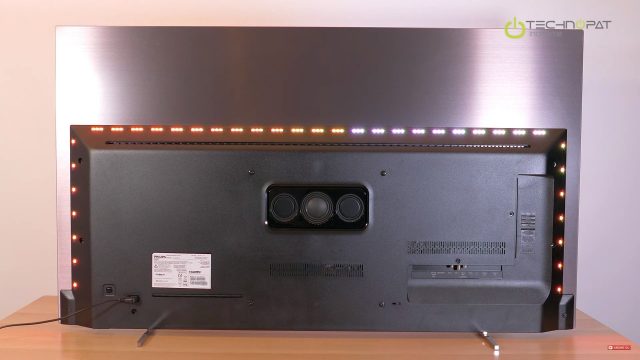 Duvara en az 20 santim mesafe bırakmak, ışıklandırma ve arka portlara erişim için de yararlı olacaktır. Arka kısımda Philips Ambilight LED’leri bulunuyor. Ambilight Hue ışıklarını da kullandığımızdan, Philips Ambilight LED’lerin oda ışıklandırmasıyla birlikte kullanımını da ayrı bir videoda anlattık. Duvar önündeyken bu ışıklar sayesinde 55 ya da 65 inçlik OLED803 modelleri, ekrandan taşıp odayı kaplayan sinematik bir deneyim sağlıyor.