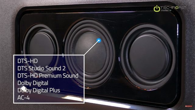 Bu televizyonun ses sistemi DTS-HD, DTS Studio Sound 2 ile DTS-HD Premium Sound sertifikalı. Dolby Digital ve Dolby Digital Plus, AC-4 gibi kodekleri de destekliyor. Kendi dahili hoparlör sistemi 2 adet tiz, 2 adet orta sürücüye ve çift pasif Woofer’a sahip. 2.1 kanal ses desteğine ve 50 Watt RMS güç çıkışına sahip. Bu televizyondan ideal sesi alabilmek için konumlandırma duvarın en az 20 santim önünde olmalı.
