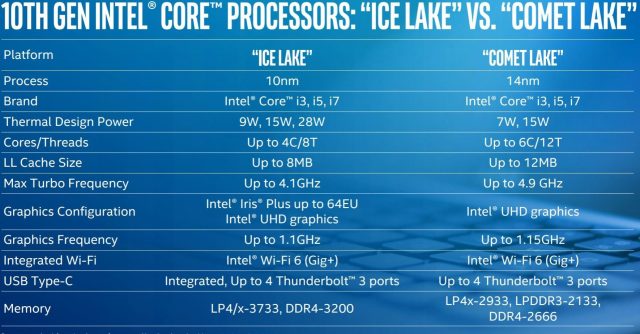 Üretkenlik odaklı olduğunun altı çizilen Comet Lake işlemciler, daha güçlü olan ve Ice Lake ile entegre olan Iris Plus yerine Intel UHD Grafikler ile geliyor. Bir diğer önemli farklılık ise U-Serisi’nde Core i7’nin ilk defa 6 çekirdek ile gelmesi. Y-Serisi’nde ise Core i5 ve Core i7 modeller artık 4 çekirdek ve 8 iş parçacığı ile geliyor. Ayrıca 7W TDP sunuyorlar. Mimari tarafında ise işlemciler çok farklı değil ve yıllardır kullanılan 14 nm çipler ile aynılar.