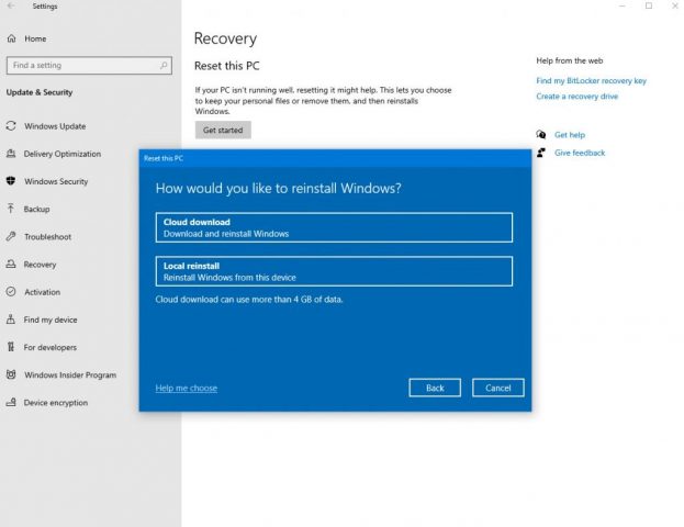 Ayrıca Windows 10 için 18970 ve daha yeni sürümlerde Bu Bilgisayarı Sıfırla seçeneğini belirleyebilir ya da Ayarlar üzerinden bulut indirme özelliğine ulaşabilirsiniz.