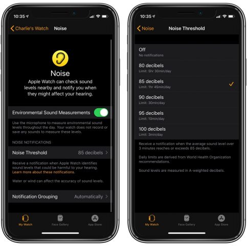 İlk adım elbette ölçüm anahtarını Açık konuma getirmek. Ardından gürültü eşiğini 80 dB, 85 dB ya da 90 dB gibi belirli bir seviyeye çekmek gerekiyor. Eşiğin ne olması gerektiği hakkında herhangi bir fikriniz yoksa, Apple Watch’daki gürültü seviyeleri ve izleme hakkında detaylı bilgilere buradan erişebilirsiniz.