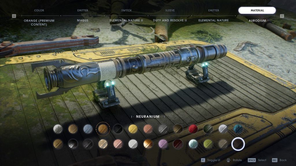 Gezegenleri dolaşırken bulduğumuz kutular sayesinde Cal kılıcını modifiye edebiliyor. Jedi Academy’deki sistemden çok daha gelişmiş bir modlama modeli kullanılmış. Kabza, düğme, sap ve ışının çıktığı kısımları ayrı desenler ve tarzlarla değiştirebiliyoruz. Ayrıca komple kabzanın rengini değiştirme seçeneği de var. Metalik tonlar dışında, akıllı telefon seçer gibi modaya uygun, gül altını, pembe, uzay grisi, neon mor gibi fantastik renkler bile seçebiliyoruz.