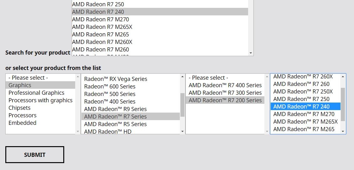Öncelikle bu bağlantı üzerinden AMD resmi destek sayfasına giriş yapalım. Gelen sayfada önce ürün türü olacak “Graphics” seçeneğini seçtikten sonra ekran kartımızın serisini seçiyoruz. Ardından ürün modelini seçtikten sonra “Submit” butonuna tıklayalım. Örneğin ekran kartı olarak RX 480 kullandığım için Raden 400 Serisini seçtim. Ekran kartımız R7 240 olsaydı Radeon R7 serisi, HD7870 olsaydı Radeon HD 7000 serisini seçecektik. Dizüstü bilgisayarda kullandığımız bir ekran kartına sahipsek M serisini veya Mobility serisini seçiyoruz.