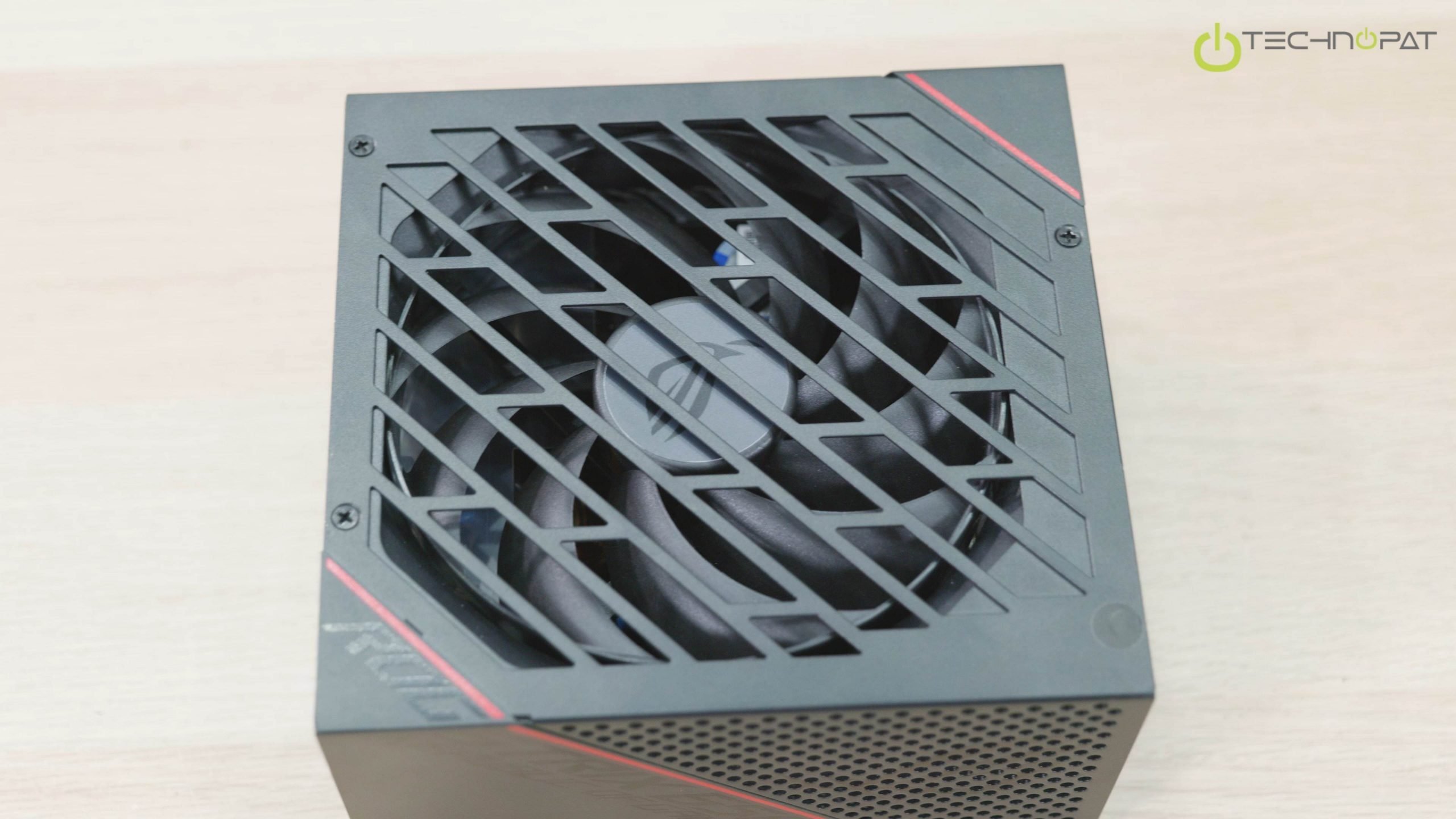 Güç kaynağına baktığımızda ilk gördüğümüz farklı fan ızgarası tasarımı ve aşırı eğimli fan bıçakları oluyor. Asus bu fan tasarımına Axial-Tech adını vermiş ve hali hazırda ekran kartlarında da kullanıyor. Bu tasarım daha küçük bir fan göbeği ve aşağı doğru hava basıncını artıran uzun kanatlar içeriyor.
