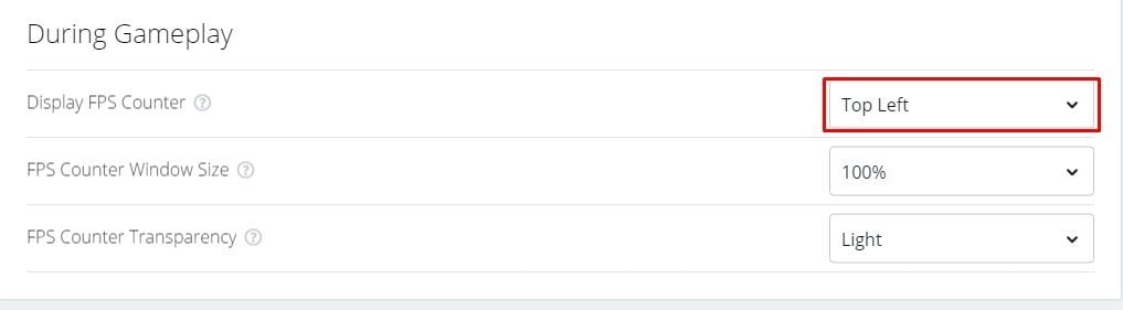 Son olarak During Gameplay menüsünden “Display FPS Counter” seçeneği ile FPS sayacının konumunu belirliyoruz. Sayacı 4 farklı yerde konumlandırma şansımız var.