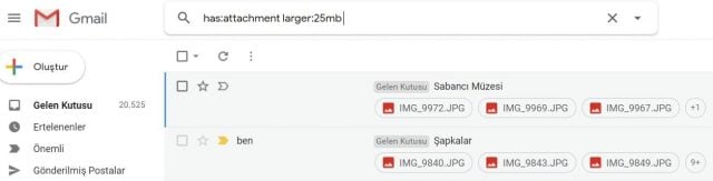 Gmail’de eski tarihli büyük boyutlu eklerin isimlerini hatırlamak mümkün değil. Bu yüzden bir filtreleme kullanmak en mantıklısı. Gmail’i açtıktan sonra arama kutucuğuna has:attachment larger:10MB yazarak sorgulayabilirsiniz. Bu komut aslında 10 MB ve üzerindeki ekleri karşınıza getiriyor. Ama boyutu büyütmek sizin elinizde. Yani aslında has:attachment larger:25MB ile benzer sorguyu gerçekleştirebilirsiniz.
