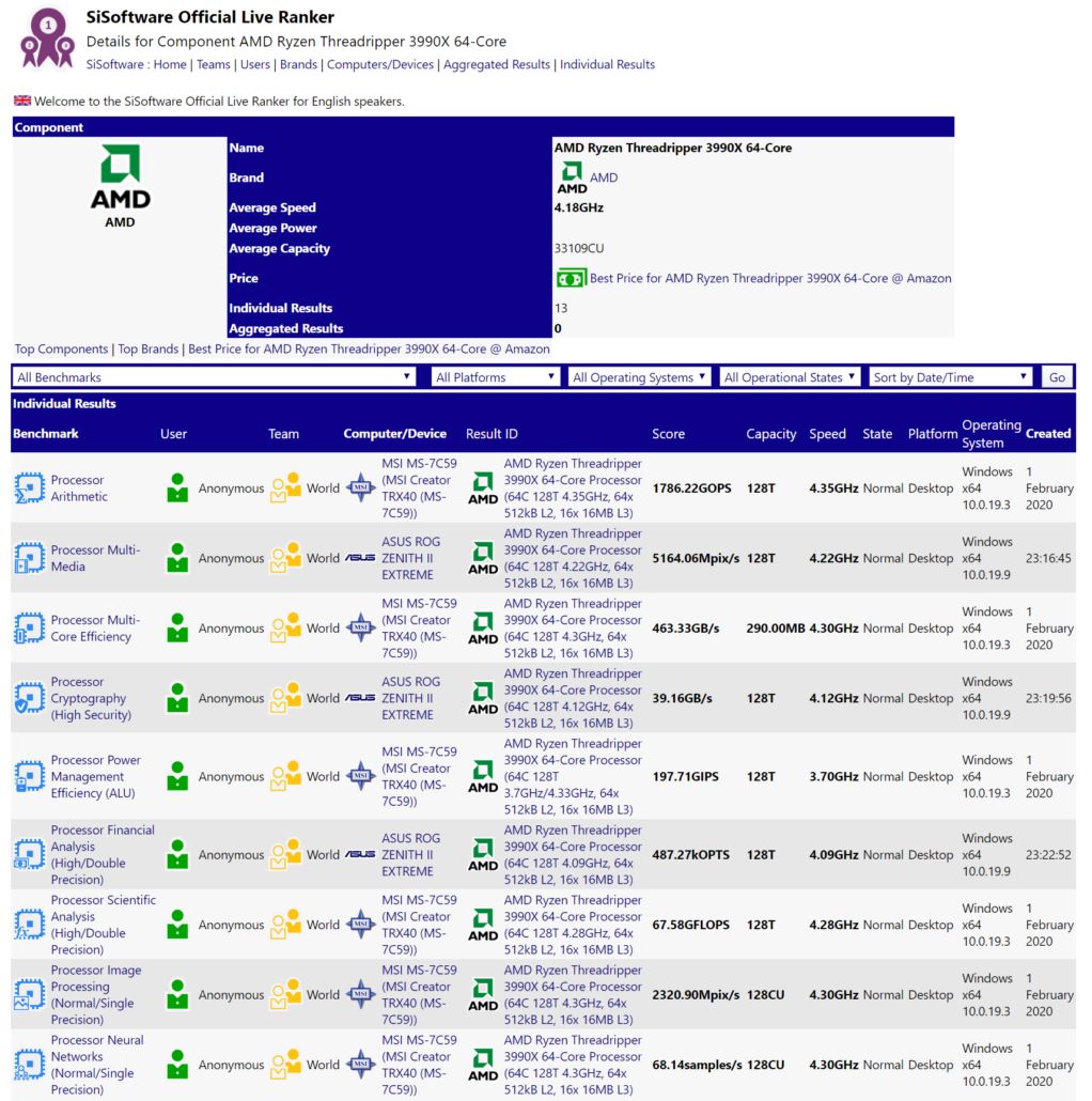 AMD’nin yeni amiral gemisi, SiSoftware benchmark veritabanında ortaya çıktı. En son kıyaslama verilerinde çip, aritmetik testte etkileyici bir performans elde ederek 1786.22 GOPS sonucuna ulaştı. Böylece 3990X, iki adet Xeon Platinum 8280 CPU’nun birleşimiyle elde edilen skorlara göre %17.8 daha iyi performans göstermiş oldu. Ayrıca CPU, testlerde 4.35 GHz’lik çalışma frekansını korumayı başardı.