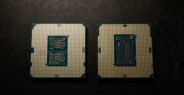 İşlemcilerin arka bölümüne baktığımızda ise (solda Core i9-10900, sağda Core i9-9900KS) soket yapısının tamamen farklılık gösterdiğini görebiliyoruz. Yeni Comet Lake-S serisi bildiğiniz üzere LGA1200 soket yapısına geçiyor. Yani yeni işlemcilerden birini kullanmak istiyorsanız 400 serisi bir anakart almanız gerekiyor.