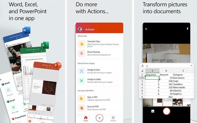 Şirketin popüler Word, Excel ve PowerPoint araçlarını cebinize getiren uygulama, mobil cihazların gücünü kullanarak daha basit ancak eksiksiz bir deneyim sunmak üzerine odaklanmış. Belge oluşturup düzenlemek dışında (bulut tabanlı olanlar da dahil) uygulama oldukça faydalı işlevler de sunuyor. Örneğin; bir belgenin fotoğrafını çekip bunu düzenlenebilir bir Word dosyasına dönüştürebiliyorsunuz. Ya da bir tablonun fotoğrafını dönüştürüp Excel’de çalışabiliyorsunuz. Sadece telefonunuzdaki fotoğrafları seçip PowerPoint’in bunlardan bir sunum tasarlamasını istemek veya Office Lens özellikleri ile belge ve beyaz tahtaların geliştirilmiş dijital görüntülerini yaratmak da mümkün.