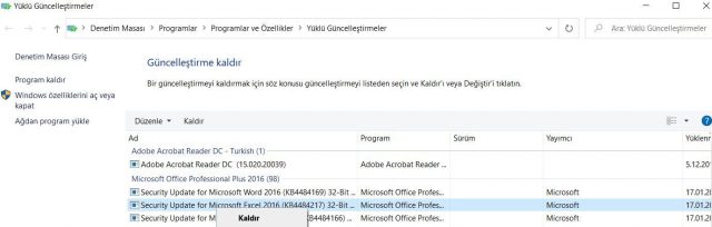 Ayrıca Denetim Masası / Programlar / Yüklü Güncelleştirmeler kısmından da detayları görebilirsiniz. Güncelleme listesini sağ üst köşesindeki arama kutusuna KB4532693 yazarak Enter’a basın. Eğer güncelleme yüklüyse bu kısımda görüntüleyebilirsiniz. Daha sonra sağ tıkla kaldırabilirsiniz.