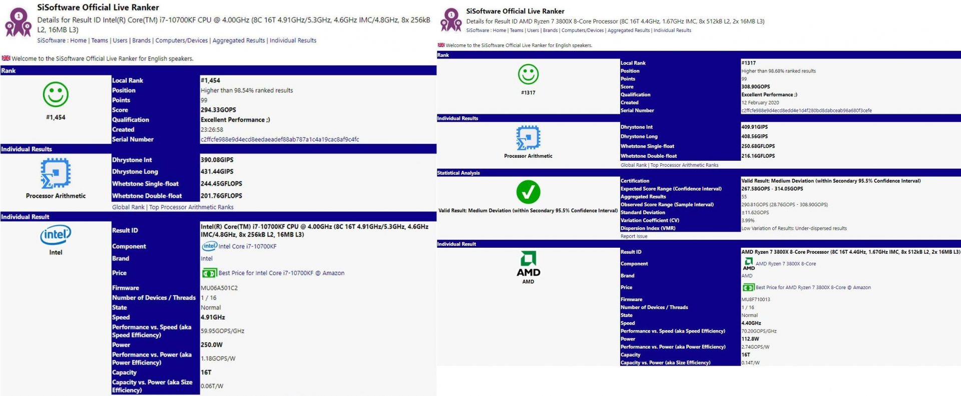 Test kriterlerine göre i7-10700KF’nin performansı Ryzen 7 3800X ile neredeyse aynı değerlerde seyrediyor. Intel’in işlemcisi 294.33 GOPS puanı alırken, Ryzen 7 3800X ise geçmiş testlerde 308.90 GOPS puana ulaşmıştı. Bu esnada i7-10700KF’nin çok daha fazla güç çektiği iddia ediliyor. Ryzen 7 3800X 2,74 GOPS/W verimlilik sağlarken, i7-10700KF görünüşte 1,18 GOPS/W gibi kötü diyebileceğimiz bir değer sunmuş.