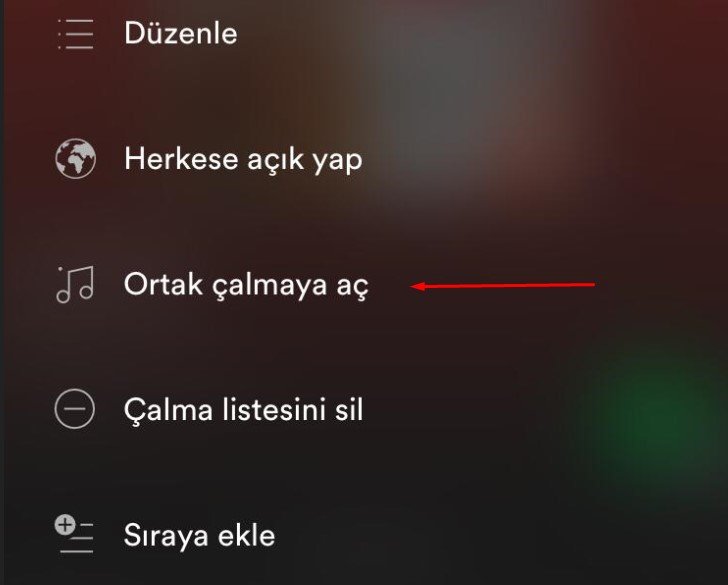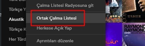 Spotify masaüstü versiyonunda ortak olarak ayarladığımız listenin üzerine gelerek “Ortak Çalma Listesi” seçeneğine tıklıyoruz.
