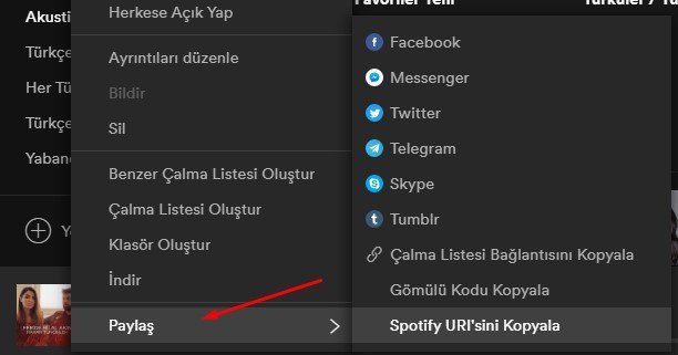 Herkese açık/ortak listeleri ve tüm şarkıları paylaşmak için masaüstü sürümde yine sağ tıklıyoruz ve “Paylaş” butonuna tıklıyoruz.